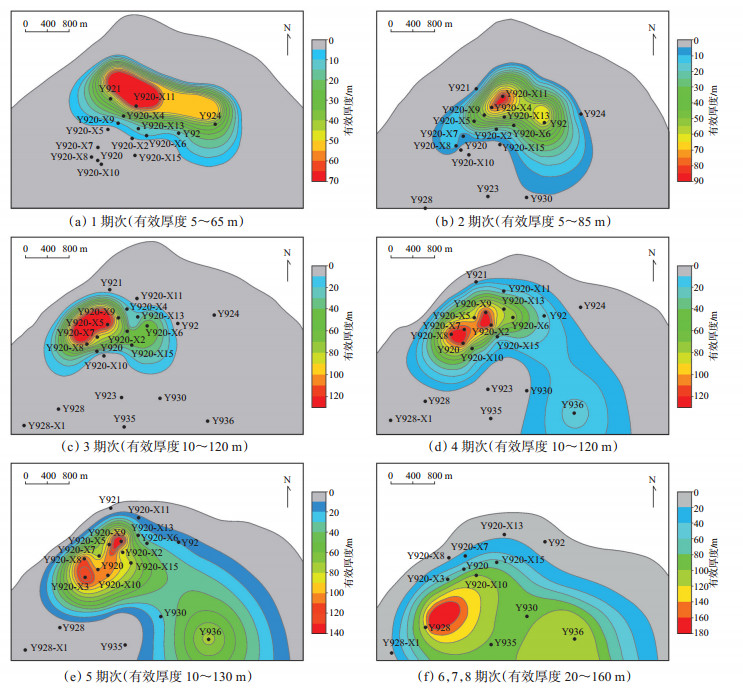 将沉积期次划分结果与三维地震资料相结合,对各沉积期次边界进行约束、刻画,在此基础上结合测井解释结论,统计单井各沉积期次的有效储层厚度,并分沉积期次表征研究区砂砾岩体有效储层的展布特征。需要说明的是,6,7,8期次因岩性主要为厚层的块状砂砾岩,地震上对沉积期次界面的反映较弱,难以追踪沉积期次边界,因此合为一个单元进行研究。图 9为各沉积期次有效储层展布等值线图,可以看出有效储层厚度中心主要位于西北部,以3,4,5期次的有效厚度较大,厚度中心相对集中,5期次的分布范围最大。由8至1期次,有效储层厚度中心由南向北迁移,由中心向四周变薄。