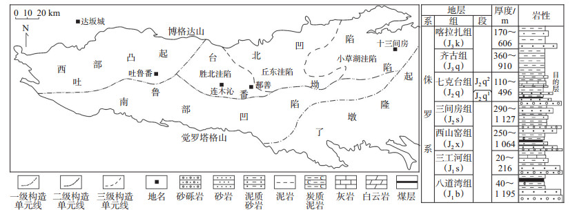 下载原图 图 1 吐哈盆地构造分区图及侏罗系地层柱状图 Fig. 1 Structural zoning map and Jurassic stratigraphic column of Turpan-Hami Basin |