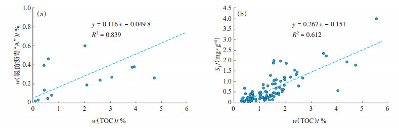 下载原图 图 10 胜北洼陷七克台组二段氯仿沥青“A”(a)和S1(b)与TOC关系图 Fig. 10 Relationship of TOC content with chloroform asphalt"A"(a)and S1(b)of the second member of Qiketai Formation in Shengbei sub-sag |