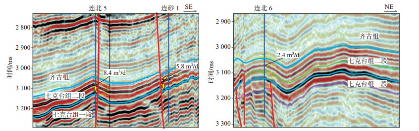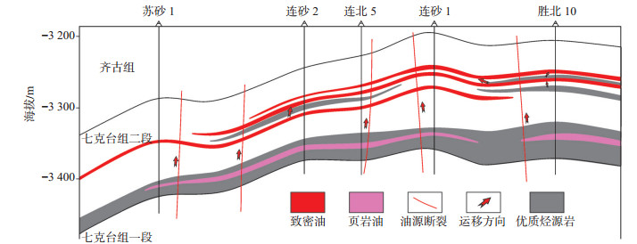 胜北洼陷共发育2组二级断裂系统。早期活动的北西—南东向逆冲断裂,受七克台组区域盖层的影响,早期逆冲断裂在塑性泥岩附近滑脱,而未断穿七克台组;晚期活动的北东—南西向走滑断裂形成于喜山期,基本断穿中侏罗统[11]。这种断裂性质的差异直接影响了油气运聚的差异。北东—南西向走滑断裂沟通烃源岩和中上部的致密储层,优质烃源岩生成的原油能够沿断层垂向运移至致密储层中汇聚成藏。试油数据对比表明,连北6井虽发育厚层烃源岩且位于鼻状隆起高部位,但其北部发育的断裂并未断至储层,南部近源的断裂规模小(非晚期活动的走滑断裂)且距离连北6井较远,12.35 MPa的异常压力(生烃增压)不能达到孔喉半径为50 nm的源储突破压力,仅靠中部的薄层烃源岩难以形成富集高产的致密油,连北6井产出的原油与同层含粉砂泥质灰岩的生物标志化合物特征相似,其产量(约为2.4 m3/d)低于同一生油中心的连北5井和连砂1井。因此,晚期油源断裂的发育程度与致密油的富集密切相关(图 11)。