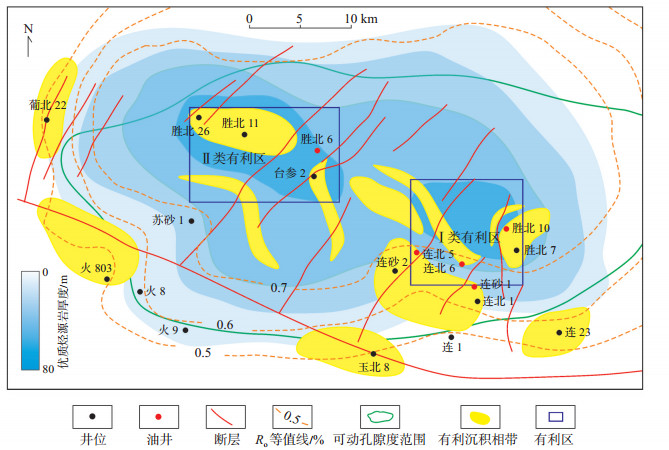 在明确成藏主控因素与成藏模式基础上,通过叠合优质烃源岩厚度、油源断裂分布、有利沉积相带展布、烃源岩成熟度、可动油储层边界得到胜北洼陷七克台组二段综合评价图,并划分出2个致密油勘探有利区,即胜北10井区和胜北6井区(图 14)。Ⅰ类有利区主要分布在洼陷南坡成熟烃源岩范围内,油源断裂发育,发育灰泥坪背景下的砂质(混积)滩坝微相,储层类型以泥质粉砂岩为主,孔隙度及渗透率均整体较高,可动油饱和度高,为最有利的勘探区。Ⅱ类有利区主要位于洼陷中心,与烃源岩厚度中心匹配,具有断裂沟通条件,发育颗粒滩和湖湾微相,储层以含陆源碎屑碳酸盐岩为主,物性中等偏差,可动油饱和度较高。