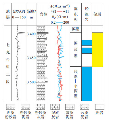 2 沉积特征吐哈盆地胜北洼陷七克台组沉积时期,古气候由温湿逐渐向干热演化,湖盆水体深度变化比较快[15]。七克台组一段沉积期水体较浅,主要发育滨浅湖—辫状河三角洲沉积体系,岩性组合为砂泥岩互层夹薄煤层[15-17]。七克台组二段沉积期,胜北洼陷整体表现为南高北低的构造格局,湖盆水体北深南浅。沉积期研究区的古构造、水深和距离物源区的远近对于陆源碎屑和碳酸盐矿物含量及分布均具有重要影响[18]。虽然部分陆源碎屑能够向湖盆中心搬运,但陆源碎屑含量整体表现为南高北低的特征。七克台组二段沉积初期,湖盆扩张,沉积水体加深,胜北洼陷主体为半深湖沉积,岩性以暗色泥岩为主,具有良好的生油能力。随后气候逐渐干热,湖盆水体变浅,碳酸盐矿物含量增多,在二段中部表现出混合沉积的特征,发育平行层理、块状层理和波状层理等沉积构造,见双壳类等浅水生物。混积岩也有一定的生烃能力,同时也具备储集油气的条件,具有源储一体的特征。在岩心相和沉积相标志分析的基础上,结合镜下薄片鉴定、全岩矿物分析等资料,认为靠近物源一侧发育滩坝微相,靠近洼陷中心一侧发育灰泥坪、颗粒滩、湖湾微相[13]。至七克台组沉积末期,气候以半干旱为主,主要为滨湖沉积,厚度超过20 m的氧化色泥岩以沉积盖层形式出现(图 2)。