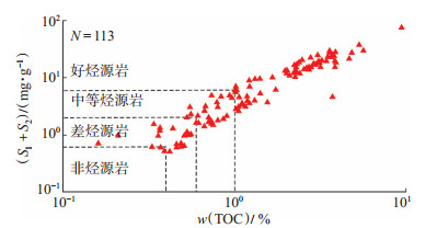 3.3 有机质丰度胜北洼陷七克台组二段烃源岩TOC质量分数为0.16%~9.46%,平均值为1.78%,其中TOC质量分数>2.0%的烃源岩占样品总数的38.9%。S1+S2为0.51~74.76 mg/g,平均值为9.55 mg/g。根据烃源岩S1+S2与TOC含量对烃源岩质量进行了判别,七克台组二段烃源岩样品具有高的有机质丰度和生烃潜力,仅个别样品为差烃源岩。由此可见,胜北洼陷七克台组二段烃源岩整体属于一套中等—好烃源岩(图 3)。
