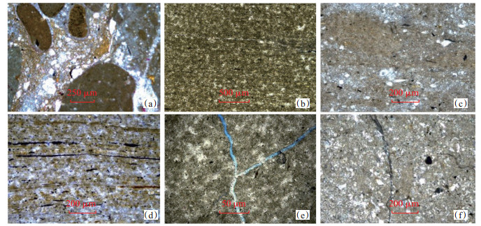 4 致密储层特征 4.1 岩石学特征吐哈盆地胜北洼陷七克台组二段储层的陆源碎屑、黏土矿物与碳酸盐矿物含量相近,具有混合沉积的特征。根据矿物相对含量和岩石组构将混积岩划分为砂屑灰(云)岩[图 4(a)]、含粉砂泥质灰(云)岩[图 4(b)]、含泥粉砂质灰(云)岩[图 4(c)]、含粉砂灰(云)质泥岩[图 4(d)]、含灰(云)粉砂质泥岩[图 4(e)]和含灰泥质粉砂岩[图 4(f)]。