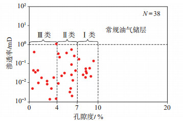 胜北洼陷七克台组二段储层的孔隙度、渗透率统计结果显示,孔隙度主要为2.6%~7.8%,渗透率普遍<1 mD。参照致密油储层物性分类标准,研究区以Ⅱ类和Ⅲ类致密储层为主(图 5)[23]。