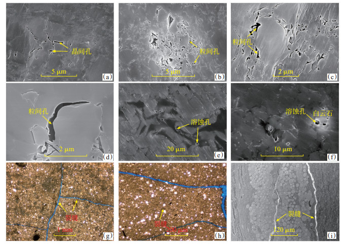 下载原图 图 6 胜北洼陷七克台组二段储集空间类型 (a)连北6井,3 484.60 m,发育晶间孔,氩离子抛光-扫描电镜;(b)连北6井,3 484.60 m,粒间孔发育,氩离子抛光-扫描电镜;(c)胜北7井,3 504.35m,石英颗粒间见粒间孔,氩离子抛光-扫描电镜;(d)连北5井,3 671.20 m,粒间孔发育,氩离子抛光-扫描电镜;(e)连北6井,3 524.23 m,发育溶蚀孔,氩离子抛光-扫描电镜;(f)连北6井,3 524.63 m,白云石溶蚀,氩离子抛光-扫描电镜;(g)连北5井,3 671.25 m,发育微裂缝,未被充填,单偏光;(h)连北5井,3 645.60 m,单偏光;(i)连北6井,3 521.94 m,微裂缝发育,氩离子抛光-扫描电镜 Fig. 6 Reservoir space types of the second member of Qiketai Formation in Shengbei sub-sag |
