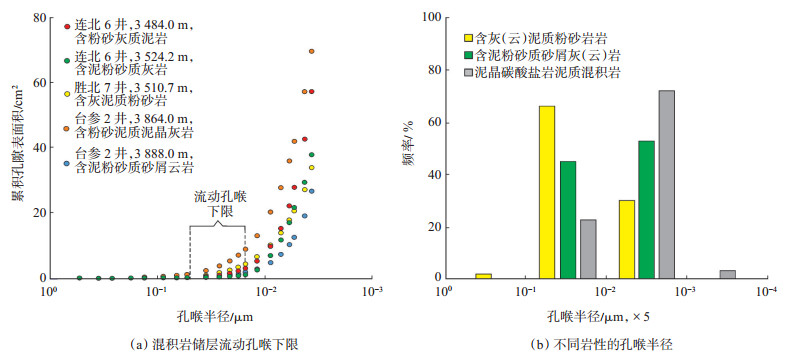 胜北洼陷七克台组二段储层以细粒混合沉积为主,在持续的成岩作用和压实作用下,储层孔隙度持续下降,并于早白垩世致密化(孔隙度<10%)[14, 25]。烃源岩从晚白垩世开始进入排烃门限,即油气开始充注时储层已经致密。对于此类“先致密,后成藏”的致密储层来讲,储层以小孔细喉为主,排驱压力较大,只有致密储层的流体可动性较强,才能成为油气富集的有效储层[26]。为此,通过比表面法来判断流动孔喉下限。流动孔喉下限对应于比表面积开始快速增大的拐点所对应的孔喉下限[27]。通过此方法确定胜北洼陷七克台组二段储层流动孔喉下限为15~50 nm,泥质混积岩和泥晶碳酸盐岩的流动孔喉下限值更高,这是由于黏土矿物具有更大的比表面积,油气流动需要更大的孔隙喉道,这与Li等[14]通过离心核磁计算得到的结果相近[图 7(a)]。根据压汞核磁联测以及扫描电镜统计,粉砂岩孔喉半径>50 nm的样品占比为69.1%,砂屑灰(云)岩孔喉半径>50 nm的样品占比为45.9%,泥晶碳酸盐岩和泥质混积岩孔喉半径>50 nm的样品占比仅为23.5%[图 7(b)]。根据流动孔喉下限与孔隙度的对应关系,确定七克台组二段流体流动的孔隙度下限为2.6%,即当孔隙度≥ 2.6%时,混积岩孔隙中的原油为可动油,当孔隙度<2.6%时,混积岩孔隙中为束缚油,难以进行有效开采[14, 27]。