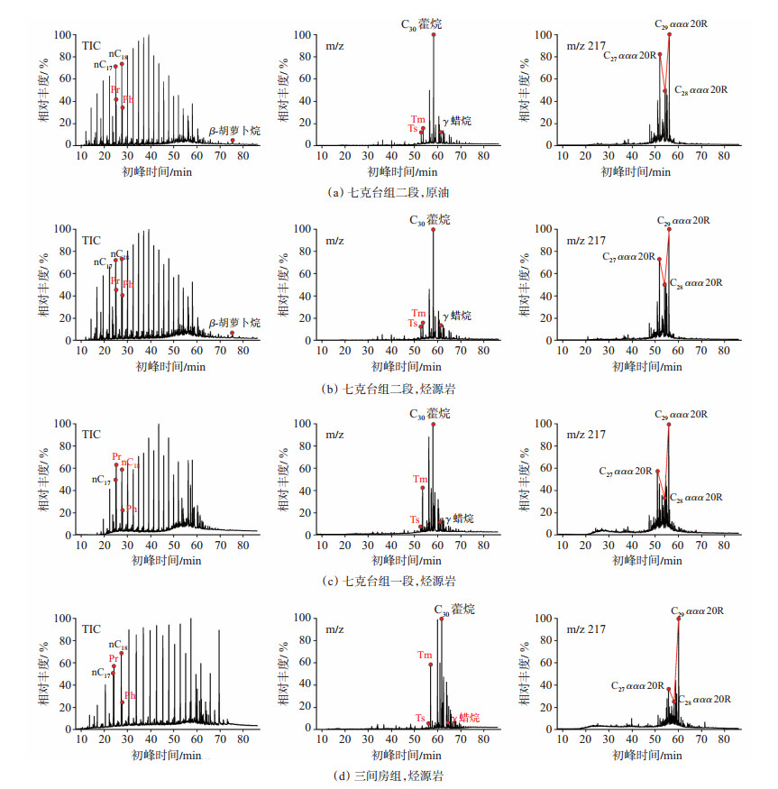 下载原图 图 8 胜北洼陷烃源岩与七克台组二段原油生物标志化合物特征对比 Fig. 8 Biomarker characteristic comparison between source rocks and crude oil of the second member of Qiketai Formation in Shengbei sub-sag |