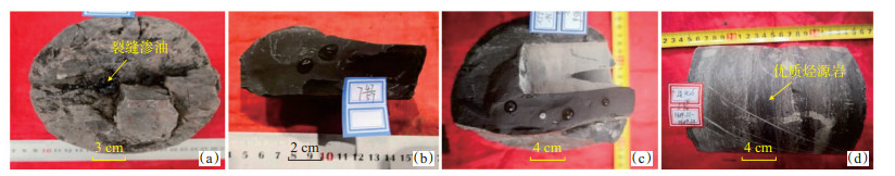 下载原图 图 9 胜北洼陷七克台组二段含油岩心观察 (a)胜北26井,4 255.91 m,含泥粉砂质云岩,裂缝渗油;(b)胜北26井,4 356.31 m,灰褐色云质泥岩,缝面含油;(c)连北6井,3 530.12 m,含粉砂泥质灰岩,抽提后TOC质量分数为6.50%;(d)连北6井,3 489.51 m,含泥粉砂质砂屑灰岩,抽提后TOC质量分数为2.23% Fig. 9 Oil-bearing core observation of the second member of Qiketai Formation in Shengbei sub-sag |
