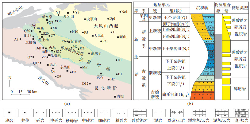 1 地质背景柴达木盆地位于青藏高原北部,周边被昆仑山、阿尔金山和祁连山环绕,盆地东西长850 km、南北宽150~300 km,面积为12.1万km2,中新生界沉积面积9.6万km2,沉积岩最大厚度17 200 m。英雄岭构造带位于柴达木盆地西部,面积为4 900 km2,包括砂西、尕斯、跃进、狮子沟、花土沟、游园沟、油砂山、英东、干柴沟、咸水泉、油泉子、黄瓜峁、开特、油墩子等地区[图 1(a)],先后发现尕斯、狮子沟、花土沟、游园游、油砂山、英东、咸水泉等碎屑岩油气田及英西、油泉子、开特、黄瓜峁等碳酸盐岩油气田。柴西地区发育新生界地层,自下而上依次为古近系古始新统路乐河组(E1+2),渐新统下干柴沟组下段(E31)、上段(E32);新近系中新统上干柴沟组(N1),上新统下油砂山组(N21)、上油砂山组(N22)、狮子沟组(N23);第四系更新统七个泉组(Q),下伏地层为基岩[图 1(b)]。
