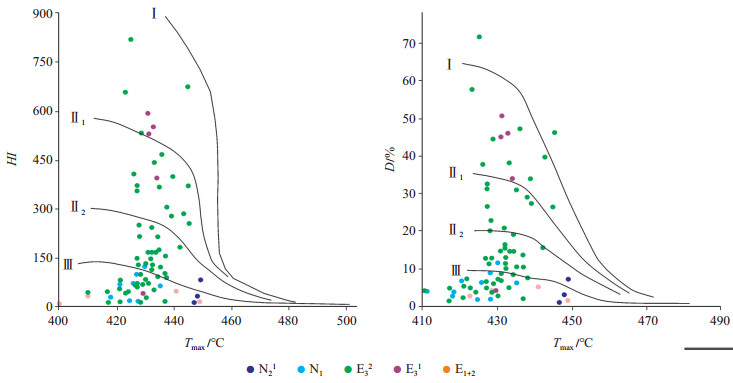 (2) 有机质类型。根据英雄岭构造带烃源岩样品热解参数,烃源岩有机质类Ⅰ—Ⅲ型皆有。古近系烃源岩有机质类型偏腐泥型,中低等水生生物来源的有机质较多,主要为Ⅰ—Ⅱ1型有机质;新近系烃源岩有机质类型相对偏腐殖型,来源于陆源高等植物,主要为Ⅱ2—Ⅲ型有机质(图 10),反映出古近系烃源岩生油能力要强于新近系。