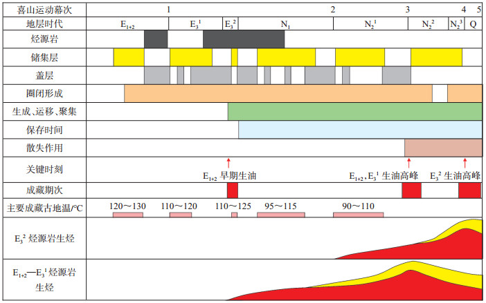 (2) 英雄岭构造带是有利的油气聚集带,油气存在3期充注过程,分别对应E32早期(E1+2烃源岩进入早期生油阶段)、N21末期(E1+2—E31烃源岩达到生油高峰)、N23—Q(E32生油高峰),其中N21末期、N23—Q是古近系—新近系含油气系统关键成藏期,圈闭形成期与生、排烃期具有良好匹配性;存在上生下储型、源-储一体型及下生上储型等3种源-储组合关系,形成构造、构造-岩性、岩性油气藏。