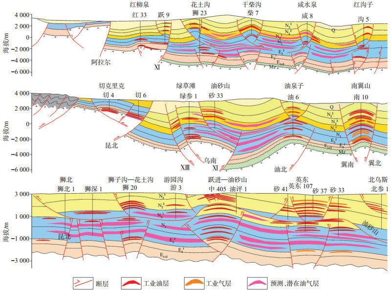 南带由狮子沟(英西)、英中、英东构造组成,浅层构造发育狮子沟—油砂山背斜,深层构造发育狮子沟深部、油砂山深部2个大规模的构造楔,导致狮子沟、油砂山构造带大幅度隆升,影响英雄岭深层的地质结构和变形。英西深层构造为含盐构造楔状挤入构造,逆冲岩片堆垛叠置导致深层下干柴沟组大幅加厚,膏盐层之上浅层发育滑脱构造,膏盐层之下深层发育叠瓦状冲断构造[图 2(b)],垂向上具有明显双层结构特征,而英中地区逆冲岩片的垂向叠置不显著,但构造楔的特征明显,至英东构造塑性地层已由膏盐、岩盐相变为泥岩、泥灰岩等,Ⅺ断裂和油砂山断裂构成的楔状体一方面抬升掀斜油砂山的北翼,一方面抬升油砂山断层的下盘。中带为向南东方向潜伏的干柴沟构造[图 2(b)]。北带包括咸水泉、油泉子、开特米里克以及油墩子构造,受英北断层控制,由一系列北西走向的断层传播褶皱组成,具有较大的差异性。在咸水泉北段,英北断层为盲冲断层,断层未切穿地表,具有完整的背斜形态;油泉子地区在英北断层上盘形成一组宽缓背斜上的断块构造;开特、油墩子构造带,背斜构造紧闭而规模较小。