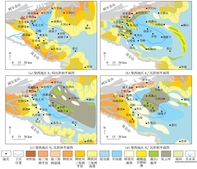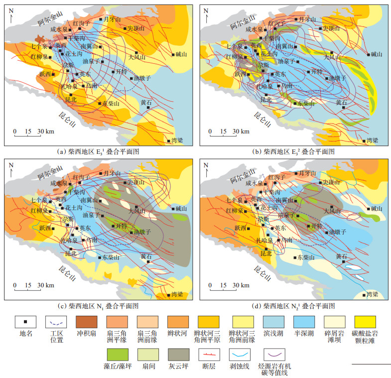 从储集体平面分布特征看,下干柴沟组下段沉积时期[图 5(a)],英雄岭构造带的西段以扇三角洲沉积为主,中段及东段以湖相沉积为主,局部受到柴西北、东柴山辫状河三角洲沉积影响;下干柴沟组上段沉积时期[图 5(b)],英雄岭构造带西段除了发育有扇三角洲沉积,英西、干柴沟地区还发育碳酸盐岩藻丘、颗粒滩及灰云坪沉积,在中段至东段以湖相沉积为主,在西侧尕斯、跃进等地区发育藻丘、灰云坪沉积;上干柴沟组沉积时期[图 5(c)],在湖退沉积背景下,英雄岭构造带西段山前带发育扇三角洲及碳酸盐岩藻丘沉积,中段及东段的花土沟、尕斯、英东等地区发育碎屑岩滩坝沉积,油泉子到开特地区发育碳酸盐岩藻丘(席)及混积岩沉积;下油砂山组沉积时期[图 5(d)],在湖退沉积背景下,英雄岭构造带西段山前带发育扇三角洲沉积,中段及东段的砂西至尕斯等地区发育辫状河三角洲沉积,在构造带主体的花土沟、油砂山、英东、乌南等地区发育碎屑岩滩坝沉积,在油泉子至开特地区发育碳酸盐岩藻丘及混积岩沉积。