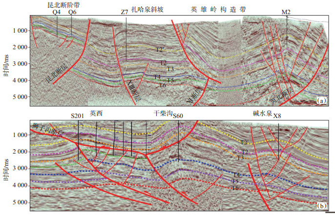 2.1 英雄岭构造带构造特征 2.1.1 英雄岭构造带断裂特征英雄岭构造带受昆北断裂、Ⅺ断裂以及英北断裂控制[图 2(a)],自南向北分为狮子沟(英西)—油砂山构造带、干柴沟构造带、咸水泉—油泉子—开特米里克—油墩子构造带[图 2(b)],由一系列北冲的逆冲推覆构造、楔状构造以及断层传播褶皱组成,具有"南北分带、东西分段"的特征。