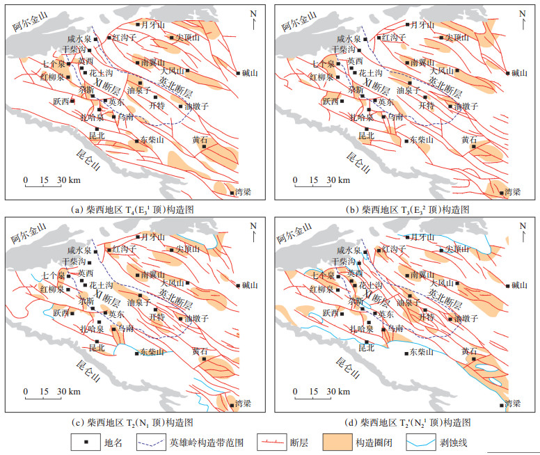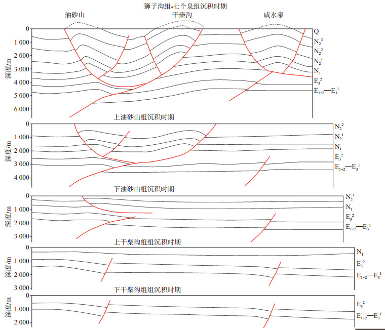 2.1.3 构造演化特征英雄岭构造带是柴西地区构造变形最为强烈的地区,形成于喜马拉雅运动晚期,发育挤压褶皱、压扭断裂、挤压断块等构造类型,新生代以来经历了3个构造演化阶段(图 4)。