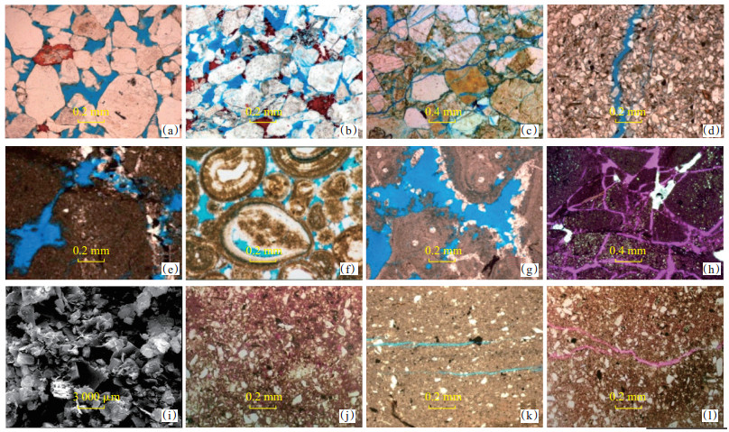 下载原图 图 6 英雄岭构造带储层类型及储集空间特征 (a)中粗粒长石岩屑砂岩,粒间孔,Z7-1-2井,353,2.30 m;(b)含灰细中粒长石岩屑砂岩,长石及岩屑溶孔,S41井,1 487.06 m;(c)长石岩屑砂岩,粒内缝、裂缝,SXZ-11井,2 217.55 m;(d)含灰粉砂岩,裂缝,W11-1401井,1 326.89 m;(e)砾屑灰/云岩,粒间孔、溶孔,S43井,3 913.05 m;(f)亮晶鲕粒灰岩,粒间及粒内溶孔发育,环边方解石胶结,SZ299井,631.13 m;(g)藻灰/云岩,溶孔发育,环边方解石胶结,W11-1401,1 350.85 m;(h)颗粒灰岩,原生粒间孔、裂缝,Y109井,538.52 m;(i)泥晶灰岩,晶间孔,Y15井,360.62 m,扫描电镜;(j)粉砂质泥灰岩,微孔隙,Q3-3井,1 294.20 m;(k)含粉砂泥灰岩,裂缝,X8井,2 765.70 m;(l)粉砂质泥灰岩,裂缝被充填,Q3-3井,1 251.39 m Fig. 6 Reservoir types and reservoir spaces in Yingxiongling structural belt |