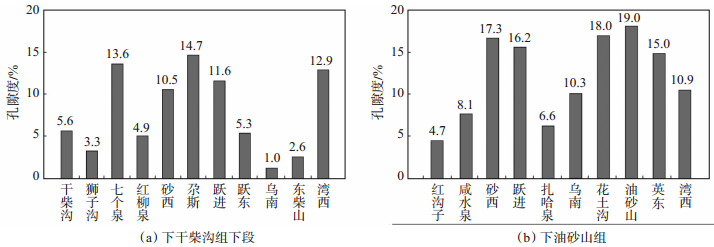 碎屑岩类储层,主要有扇三角洲、辫状河三角洲、滩坝等储集砂体。其中,扇三角洲储层成分成熟度低—中等、结构成熟度低,泥质杂基含量高(质量分数多数大于10%)、分选差—极差;辫状河三角洲储层成分成熟度中等—高、结构成熟度中等—高,杂基含量低、分选中等—好;滩坝储层成分成熟度中等—高、结构成熟度高,杂基含量低、分选中等—好。从储集空间类型来看,以原生粒间孔[图 6(a)]为主,体积占比达70%以上;其次为溶蚀孔[图 6(b)],表现为长石、岩屑溶蚀扩大孔;少量裂缝,主要粒内微缝、长石解理缝、成岩粒内缝及构造缝[图 6(c)—(d)]。古近系下干柴沟组下段沉积时期储层物性相对较差[图 7(a)],孔隙度多小于10%,但在尕斯、跃进等地区物性相对较好,如YB1井E31孔隙度达到10%以上;新近系下油砂山组储层物性要好于古近系[图 7(b)],尕斯、砂西、跃进、油砂山、英东、游园沟、花土沟等均发育优质储集体,孔隙度平均达到10%以上。