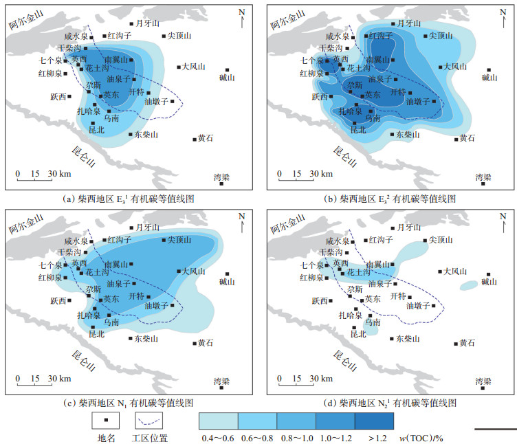 英雄岭构造带位于柴西古近系—新近系含油气系统内,据苏爱国等[31]、陈琰等[32]对古近系—新近系烃源岩研究,认为古近系下干柴沟组下段顶部、下干柴沟组上段、新近系上干柴沟组、下油砂山组等发育多套烃源岩(图 8)。英雄岭构造带下干柴沟组下段(E31)顶部优质烃源岩[图 8(a)]主要发育在干柴沟—花土沟—油泉子之间,总有机碳(TOC)质量分数多大于1.0%;下干柴沟组上段(E32)是盆地最优质的烃源岩发育段,柴西地区烃源岩分布面积达1.26万km2,厚度达1 000 m,英雄岭构造带有机碳质量分数大于1.0%的地区主要分布在英东-油泉子之间及英西以西[图 8(b)];上干柴沟组(N1)沉积时期有机碳含量低于古近系,有机碳质量分数大于0.8%的地区主要分布在花土沟—英东—扎哈泉以东、乌南以北[图 8(c)];下油砂山组(N21)烃源岩品质较差,分布较局限,仅分布在花土沟—油泉子之间[图 8(d)]。可见,英雄岭构造带发育多套烃源岩,烃源岩基础好。