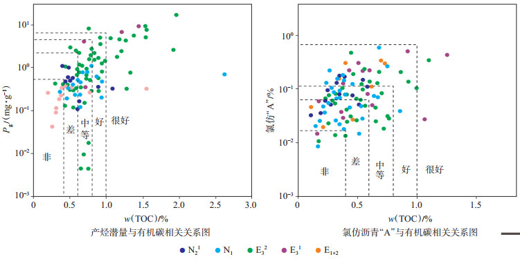 (1) 有机质丰度。柴西地区古近—新近系咸化湖相烃源岩有机碳含量偏低,且低于国内其他淡水湖相烃源岩,但其生烃潜量远高于相同TOC含量的淡水湖相烃源岩,反映生烃潜力较大。据张斌等[4]研究,古近系—新近系咸化湖相有效烃源岩有机碳质量分数下限为0.4%,当TOC达到0.6%时即成为中等烃源岩(表 4)。根据氯仿沥青"A"和有机碳的关系,古近系烃源岩有机质丰度明显较高,主要分布在中等—好级别,新近系样品则属于差—好级别烃源岩。整体上英雄岭构造带古近系烃源岩有机质丰度高于新近系烃源岩有机质丰度(图 9)。