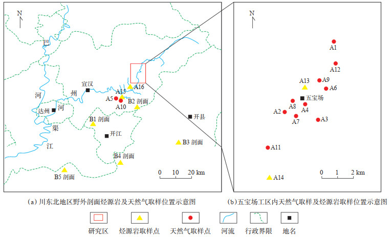 烃源岩样品采自川东北地区沙溪庙组下伏烃源岩地层,包括自流井组和须家河组。野外剖面包括B1剖面、B2剖面、B3剖面、B4剖面、B5剖面共5个剖面。五宝场工区内2口生产井岩心样品:A13井、A14井。五宝场工区及邻区4口钻井岩屑样:A13井、A15井、A7井、A16井(图 2)。