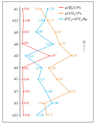 川东北五宝场地区侏罗系沙溪庙组天然气组分平面上由南到北整体变化趋势不大(图 4),只有A8井的H2S含量最高,疑似有下伏地层H2S混入,A8井CO2含量最高,与H2S含量高保持一致性。A8井、A9井、A2井、A11井甲烷与乙烷碳同位素差值相较于其他井低。A5井和A10井飞仙关组、长兴组天然气碳同位素相对较重,五宝场地区沙溪庙组天然气碳同位素相对较轻,由此推测A8井、A9井、A2井、A11井有少量混入下伏地层的甲烷。在垂向上由于五宝场地区地势平缓,气层深度变化不大,断裂构造少,其垂向上天然气组分无明显趋势变化。