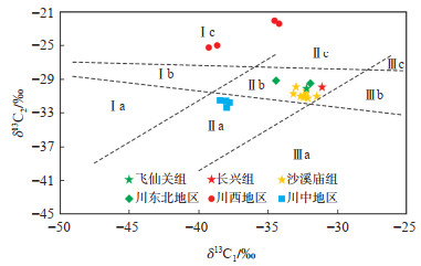 下载原图 图 5 川东北五宝场地区侏罗系沙溪庙组δ13C1-δ13C2气源类型判断图版[3] Ⅰa.成熟油型气;Ⅰb.成熟油型气-煤层气混合气;Ⅰc.成熟煤层气;Ⅱa.高熟油型气;Ⅱb.高熟油型气-煤层气混合气;Ⅱc.高熟煤层气;Ⅲa.过熟油型气;Ⅲb.过熟油型气-煤层气混合气;Ⅲc.过熟煤层气 Fig. 5 Judgement chart of δ13C1 -δ13C2 gas source types of Jurassic Shaximiao Formation in Wubaochang area, northeastern Sichuan Basin |