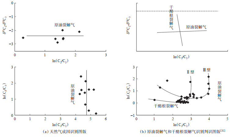 川东北五宝场地区天然气成因识别图版和Prinzhofer等[32]的识别图版(图 6)对比表明,川东北五宝场地区天然气碳同位素具有天然气随裂解程度增加,ln(C1/C2)值和ln(C2/C3)值均基本保持不变,而ln(C2/C3)和δ13C2-δ13C3值均增加的特征,即五宝场地区沙溪庙组天然气具有原油裂解气特征。