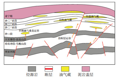 3.2 成藏模式川东北大巴山前缘五宝场地区浅层致密气藏在勘探开发中取得了重大突破,其典型气藏的成藏模式图(图 7)显示,该类气藏具有“深源浅聚、相储密切、断裂输导、圈闭富集”的成藏富集规律[34-35]。