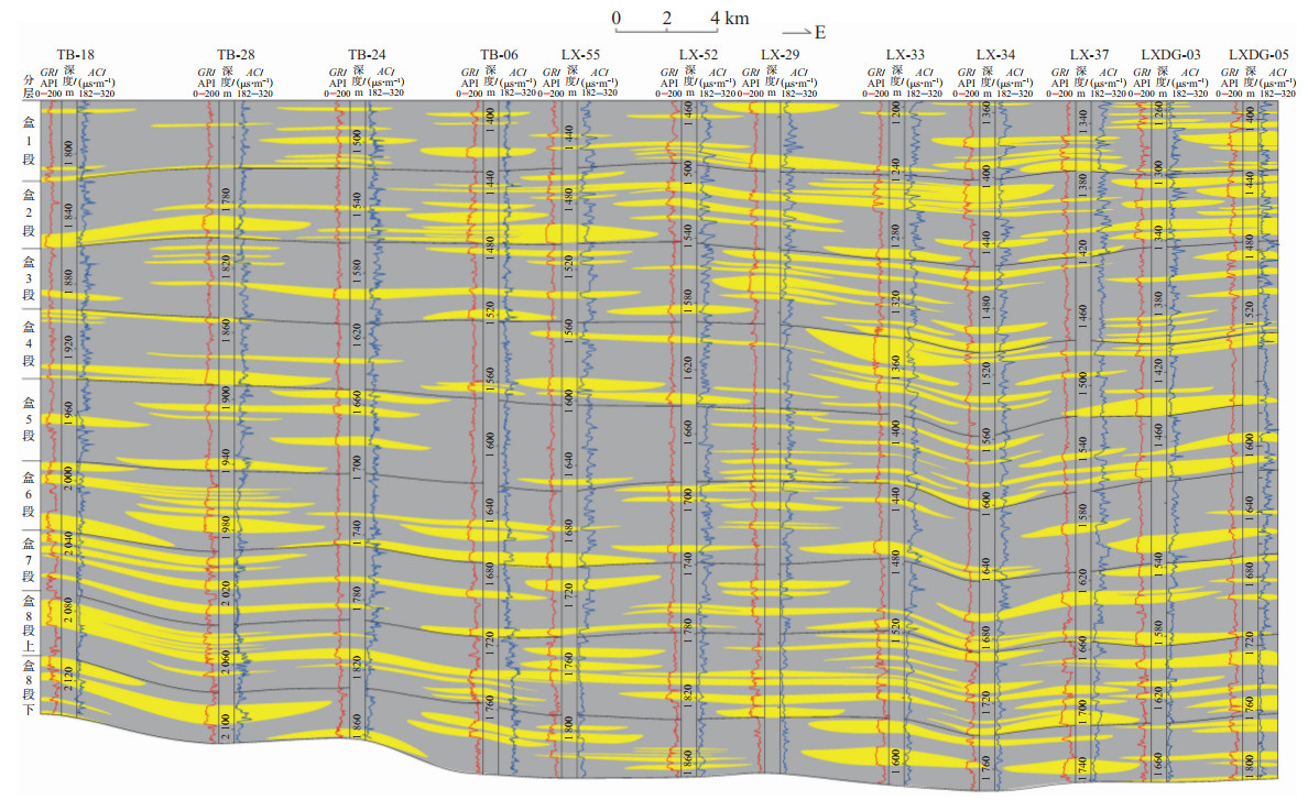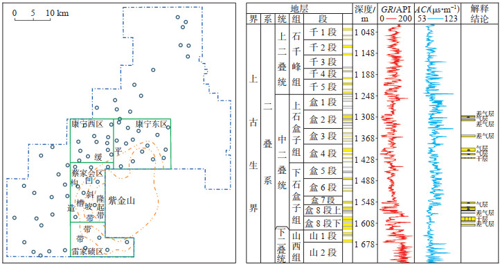 1 地质概况临兴地区位于鄂尔多斯盆地东部的西晋挠折带(图 1),区内发育紫金山岩体。石盒子组发育于上古生界二叠系中统,地层东高西低。区内断层、构造、裂缝受燕山期、喜马拉雅期构造作用和紫金山隆起的影响。下石盒子组发育辫状河三角洲平原亚相,发育分流河道与河道间湾微相,砂体发育,具有厚度大,连通性强的特征;上石盒子组发育曲流河三角洲平原亚相,发育分流河道、分流间湾和河口坝微相,砂体在空间上展布不均,局部发育较厚砂体[15-16]。近些年来的勘探开发表明,研究区的盒2段、盒4段、盒6段、盒7段、盒8段均有不同程度含气,存在较大的勘探潜力。