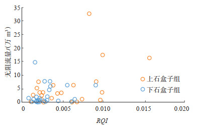 RQI可作为反映微观孔隙结构与岩石物理性质的参数,其与产量呈正相关关系(图 10),说明孔喉半径大、分选性好、渗透率高的储层有利于天然气聚集。整体上,上石盒子组的储层品质指数大于下石盒子组,这与区内上石盒子组天然气无阻流量高于下石盒子组的情况相吻合。