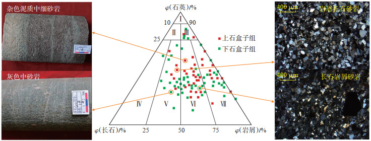 下载原图 图 2 临兴地区二叠系石盒子组砂岩类型三角图 Ⅰ. 石英砂岩;Ⅱ. 长石石英砂岩;Ⅲ. 岩屑石英砂岩;Ⅳ. 长石砂岩;Ⅴ. 岩屑长石砂岩;Ⅵ. 长石岩屑砂岩;Ⅶ. 岩屑砂岩 Fig. 2 Triangular diagram of sandstone types of Permian Shihezi Formation in Linxing Formation |