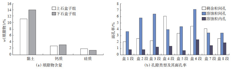 下载原图 图 3 临兴地区二叠系石盒子组填隙物含量与孔隙类型 Fig. 3 Pore-filling content and pore types of Permain Shihezi Formation in Linxing area |