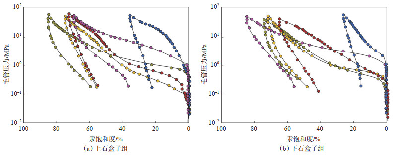 研究区整体表现为以微米级孔喉为主的特征,孔喉半径中值达0.01~0.60 μm。孔喉半径与物性之间存在较好的线性关系。下石盒子组存在极个别异常值,表现为低孔高渗的特征,体现了裂缝对致密储层的改造作用。其中上石盒子组的排驱压力为0.22~1.55 MPa,平均值为0.75 MPa;孔喉中值半径为0.03~0.40 μm,平均值为0.17 μm;分选系数为1.27~3.21,平均值为1.97;退汞效率为13.65%~ 49.29%,平均值为32.58%。下石盒子组排驱压力为0.11~8.75 MPa,平均值为1.50 MPa;孔喉中值半径为0.01~0.60 μm,平均值为0.14 μm;分选系数为0.86~3.20,平均值为1.99;退汞效率为26.60%~ 44.57%,平均值为36.15%。根据以上参数(表 2)表明,石盒子组均表现为孔隙小、分选性差、孔喉连通性差的特征,相比之下,下石盒子组储层的孔隙更小,分选性更差,但孔喉连通性相对更好(图 4)。