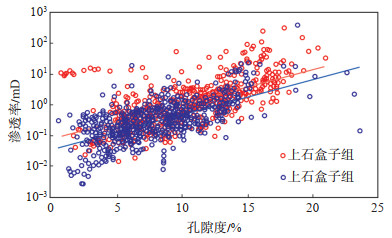 根据常规物性统计分析表明(表 3),临兴地区表现为各层段整体为低孔低渗,局部层段为相对高孔高渗。根据数据统计得知,石盒子组孔隙度与渗透率具有一定的正相关关系,上石盒子组物性整体好于下石盒子组,多层段孔隙度 < 10%,个别层段具有低孔高渗现象,此现象可能与裂缝的局部发育有关(图 5)。