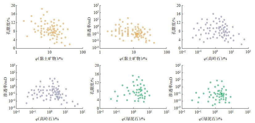 下载原图 图 8 临兴地区二叠系石盒子组黏土矿物含量与孔渗交会图 Fig. 8 Cross plot of clay mineral content and porosity and permeability of Permian Shihezi Formation in Linxing area |