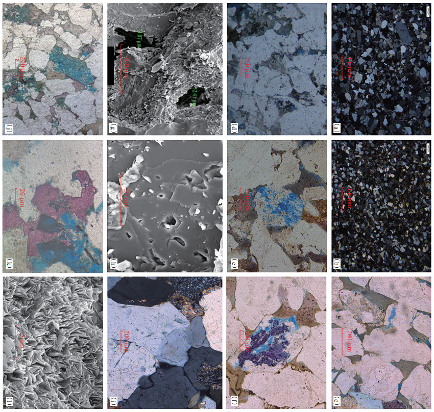 下载原图 图 9 临兴地区二叠系石盒子组典型成岩作用 (a)全貌,m井,1 901.45 m,上石盒子组,正交偏光;(b)全貌,m井,2 080.33 m,下石盒子组,正交偏光;(c)颗粒点—线接触,n井,1 558.61 m,上石盒子组,单偏光;(d)颗粒凹凸接触,o井,1 660.21 m,下石盒子组,单偏光;(e)长石颗粒溶蚀,p井,1 354.66 m,上石盒子组,单偏光;(f)长石颗粒溶蚀被方解石充填,q井,1 604.85 m,下石盒子组,单偏光;(g)溶蚀孔隙,最大直径约74 μm,r井,1 737.31 m,下石盒子组,SEM;(h)方解石溶蚀微孔,s井,1 442.74 m,上石盒子组,SEM;(i)石英次生加大,t井,1 785.42 m,下石盒子组,正交偏光;(j)长石颗粒溶蚀被绿泥石充填,u井,1 415.43 m,上石盒子组,单偏光;(k)方解石胶结物,v井,1403.67 m,上石盒子组,单偏光;(l)颗粒表面绿泥石化,w井,1 368.14 m,上石盒子组,SEM Fig. 9 Typical diagenesis of Permian Shihezi Formation in Linxing area |