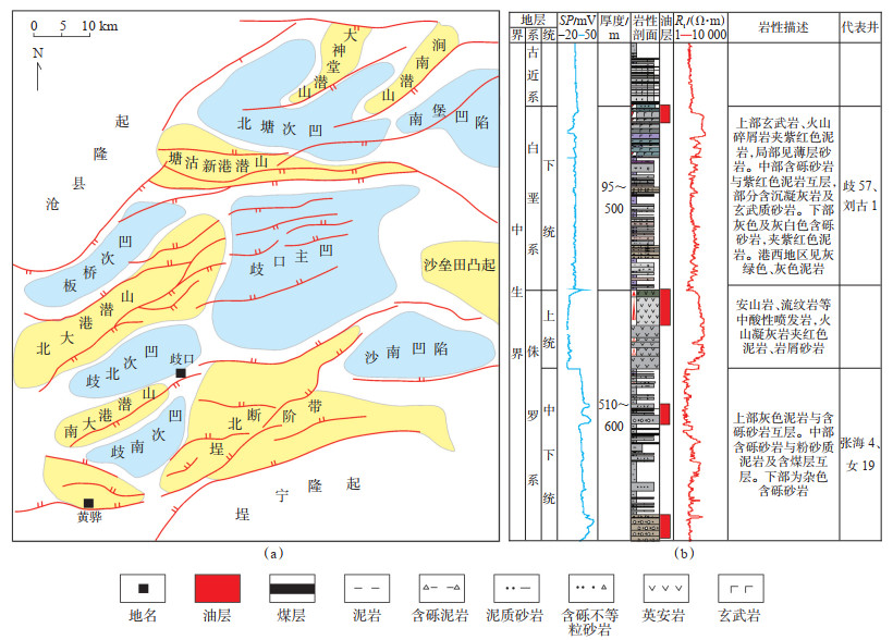 1 地质概况黄骅坳陷歧口凹陷位于沧县隆起、埕宁隆起与沙垒凸起之间,本次研究的北大港潜山位于歧口主凹的西南侧,板桥次凹的东南侧,塘沽新港潜山的南侧,歧北次凹的西北侧。潜山与凹陷之间发育有各类斜坡,斜坡与潜山区域发育有多条近北东—南西走向的断层[图 1(a)]。研究区中生界自下而上依次残存有侏罗系和下白垩统地层,厚度为0~ 600 m,以碎屑岩沉积为主,在沿断裂附近的井区分布有安山岩、玄武岩和凝灰岩等[图 1(b)]。研究区中生界以内陆湖泊三角洲相沉积为主,物源主要来自于该区西北部的沧县隆起及东南部的埕宁隆起,形成的沉积砂体大致呈北西—南东方向展布。