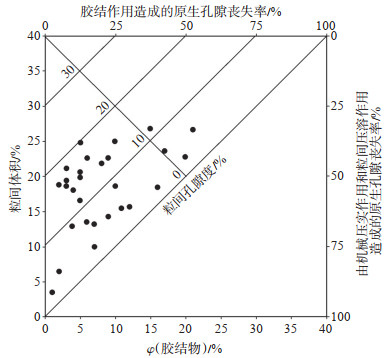 基于对目的层段4口井的岩心资料、108个扫描电镜资料、143个铸体薄片资料的统计,利用样品的面孔率、胶结物含量、粒间体积、粒间孔隙度等参数绘制其相关关系图(图 10),从图 10可以看出数据点主要落在压实作用区域,这说明压实作用对目的层段储层发育的影响远大于胶结作用的影响。