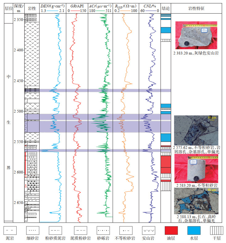 从沉积相带平面展布特征(图 7)可以看出,研究区中生界发育有浅湖、滨浅湖、河漫、辫状水道及重力流沉积[5]。不等粒砂岩、粗砂岩和中砂岩主要发育于辫状水道和重力流沉积中,粉砂岩和细砂岩主要发育于河漫、滨浅湖沉积中。结合物性分析及测井解释成果发现,物性较好的储层多分布在辫状水道及重力流沉积的砂体中,且重力流沉积砂岩中的溶蚀孔隙相对发育。