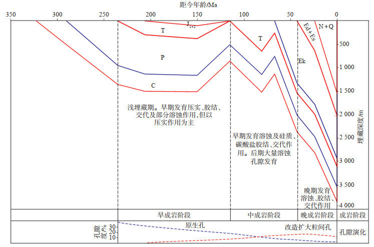 通过对单井地层埋藏演化特征资料的分析可知,研究区中生界自埋藏成岩至今至少经历了2次大的抬升和4次快速埋深的过程(图 12)。