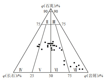 下载原图 图 2 黄骅坳陷北大港潜山区域中生界部分取心井岩石组分特征 Ⅰ. 石英砂岩;Ⅱ. 长石石英砂岩;Ⅲ. 岩屑石英砂岩;Ⅳ. 长石砂岩;Ⅴ. 岩屑石英砂岩;Ⅵ. 长石岩屑砂岩;Ⅶ. 岩屑砂岩 Fig. 2 Rock composition of some cored well segments of Mesozoic in Beidagang buried hill, Huanghua Depression |