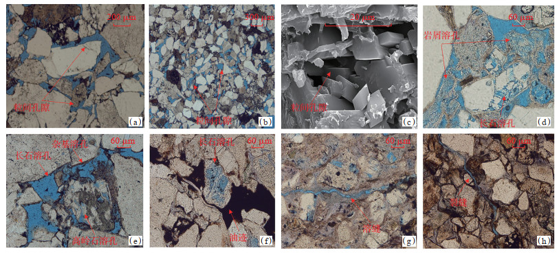 2.3 储集空间特征在研究区中生界碎屑岩储层中,可见原生孔隙[图 3(a)-(c)]、次生孔隙[图 3(d)-(f)]和微裂缝[图 3(g)-(h)]等储集空间。原生孔隙和微裂缝所占比例均较小,储集空间以次生溶蚀孔隙为主。次生溶蚀孔隙的类型较多,包括长石溶孔、岩屑溶孔(镜下可见碎屑岩岩屑溶孔、火山岩岩屑溶孔)、杂基溶孔、高岭石溶孔及少量的长石溶蚀后形成的铸模孔[图 3(d)-(f)]。
