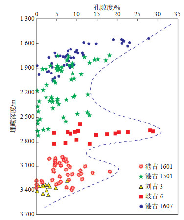 随着埋深的不断增加,储层的物性特征及储集空间演化更加复杂,而研究储层的成因机制为分析有利储层的发育规律及空间展布特征提供了依据。通过分析黄骅坳陷北大港潜山目的层段岩心孔隙度资料可以看出,中生界碎屑岩储层总体上存在2个高孔隙发育带,埋藏深度分别为2 600~2 700 m和3 100~3 200 m(图 4)。结合以往的研究成果及现场的勘探实践,认为研究区优质高孔隙度储层发育主要受沉积作用、成岩作用及成岩构造作用的综合控制。