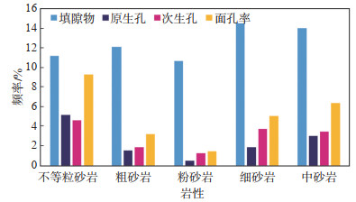 通过对铸体薄片的镜下观察与统计,发现中生界不同碎屑岩储层的填隙物含量、面孔率及溶蚀孔隙发育数量等参数差异较大(图 5)。细砂岩中填隙物含量最高,其空间分布频率大于14%;粉砂岩中填隙物含量最低,其空间分布频率小于12%。面孔率平均值最高的是不等粒砂岩,大于9%;其次是中砂岩,为6%~9%;最小的是粉砂岩,小于2%。次生孔隙最发育的是不等粒砂岩,其次是细砂岩。从图 5中还可以看出,不等粒砂岩与中砂岩的原生孔隙与次生孔隙均较发育,但不等粒砂岩的原生孔隙较次生孔隙发育,而中砂岩的次生孔隙较原生孔隙发育。
