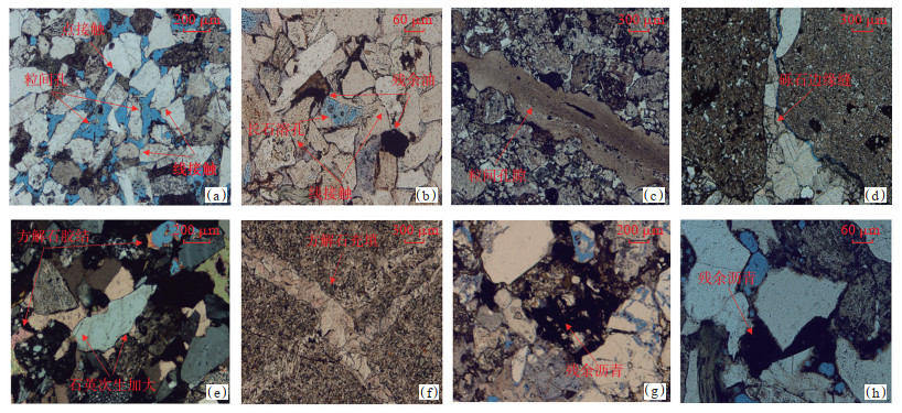 3.2.4 油气充注对储层发育的影响从镜下观察可知,研究区中生界存在油气充注过程[参见图 3(f)、图 9(b)、图 9(f)-(g)]。从油气充注后残余油分布及与其相邻溶蚀孔隙发育特征不难看出,充填残余油的孔隙内部未见溶蚀痕迹,而与残余油分布孔隙相邻的其他区域发生了不同程度的溶蚀。尽管本次研究没有深究溶蚀作用与油气充注的先后顺序及期次,但可以说明油气充注的结果阻止了孔隙溶蚀作用的进一步发生。由此可以看出,油气的充注有助于阻止原生孔隙被胶结或被溶蚀,在某种程度上对储层孔隙的改造是有利的。