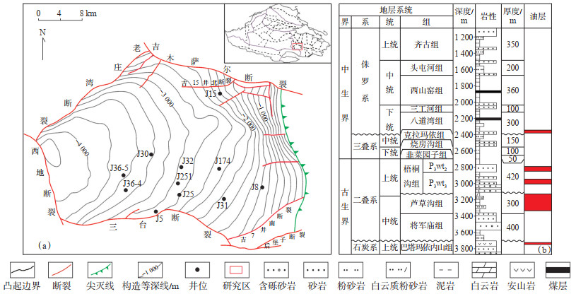 1 区域地质概况吉木萨尔凹陷位于准噶尔盆地东部,是一个西断东超的箕状凹陷,北以吉木萨尔断裂为界,南以三台断裂为界,西以老庄湾断裂和西地断裂为界,向东逐渐过渡至古西凸起,凹陷内构造平缓,总面积为1 500 km2[8](图 1)。凹陷内地层发育较为齐全,二叠系自下而上发育将军庙组(P2j)、芦草沟组(P2l)和梧桐沟组(P3wt),其中芦草沟组是页岩油开发的主要目的层系,其岩性复杂,主要以粉细砂岩、泥岩、碳酸盐岩及白云石、方解石等富集和混杂的过渡性岩类为主,其中泥岩、白云质泥岩和灰泥岩有机质含量高,生烃潜力大,是盆地内品质较好的烃源岩。