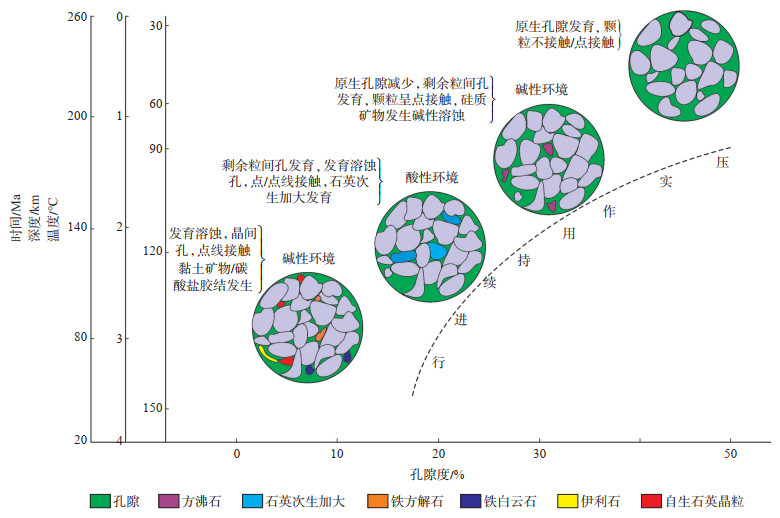 下载原图 图 10 吉木萨尔凹陷芦草沟组储层分阶段致密化过程 Fig. 10 Reservoir densification process of Lucaogou Formation in Jimsar Sag |