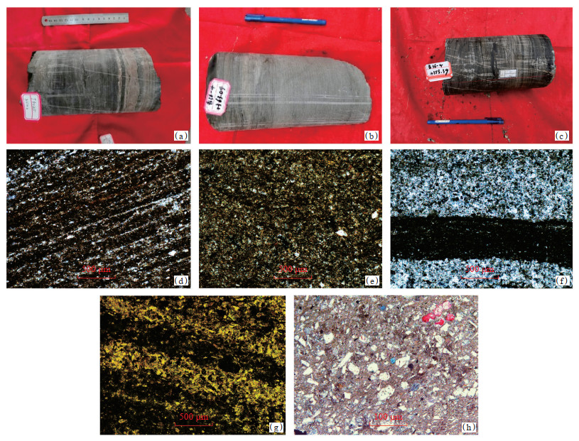 下载原图 图 2 吉木萨尔凹陷芦草沟组岩性类别 (a)砂岩与泥岩互层,吉10025井,3 614.3 m;(b)泥岩与粉砂岩互层,含少量细砂岩,吉36-4井,4 363.0 m;(c)灰质粉砂岩夹白云质泥岩及泥岩混积层序,吉36-4井,4 353.4 m;(d)纹层状混合细粒岩,纹层平直,吉36-4井,4 370.8 m;(e)块状云质泥岩,碎屑颗粒呈团块状分布,吉36-4井,4 340.4 m;(f)纹层状白云质粉砂岩,可见石英碎屑条带/泥质纹层间互,吉36-4井,4 340.0 m;(g)纹层状泥质白云岩,纹层平直,局部透镜状,吉36-4井,4 353.3 m;(h)铸体薄片,沉凝灰岩,吉174井,3 241.9 m Fig. 2 Lithologies of Lucaogou Formation in Jimsar Sag |