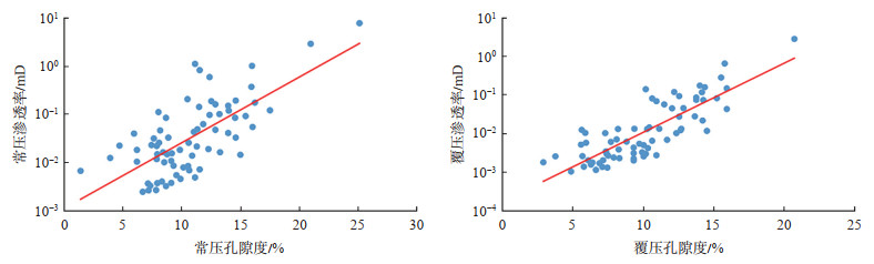 对吉木萨尔凹陷芦草沟组72个样品进行物性分析,结果表明,芦草沟组储层孔隙度为1.2%~ 20.4%,平均为7.34%,渗透率为0.01~0.80 mD,平均为0.08 mD。由此可见,芦草沟组储层整体物性条件较差,储层致密化程度高,常规气测孔渗和覆压孔渗关系显示其孔渗相关性较好,在一定程度上说明该储层受微裂缝影响较小,且微裂缝在储层中发育较少(图 3)。